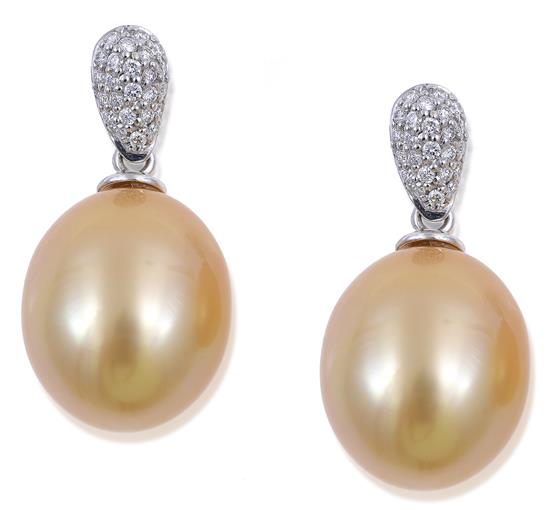 Each oval pearl of gold hue measuring 14.00mm, suspended from a pave set diamond panel, mounted in 18ct white gold.