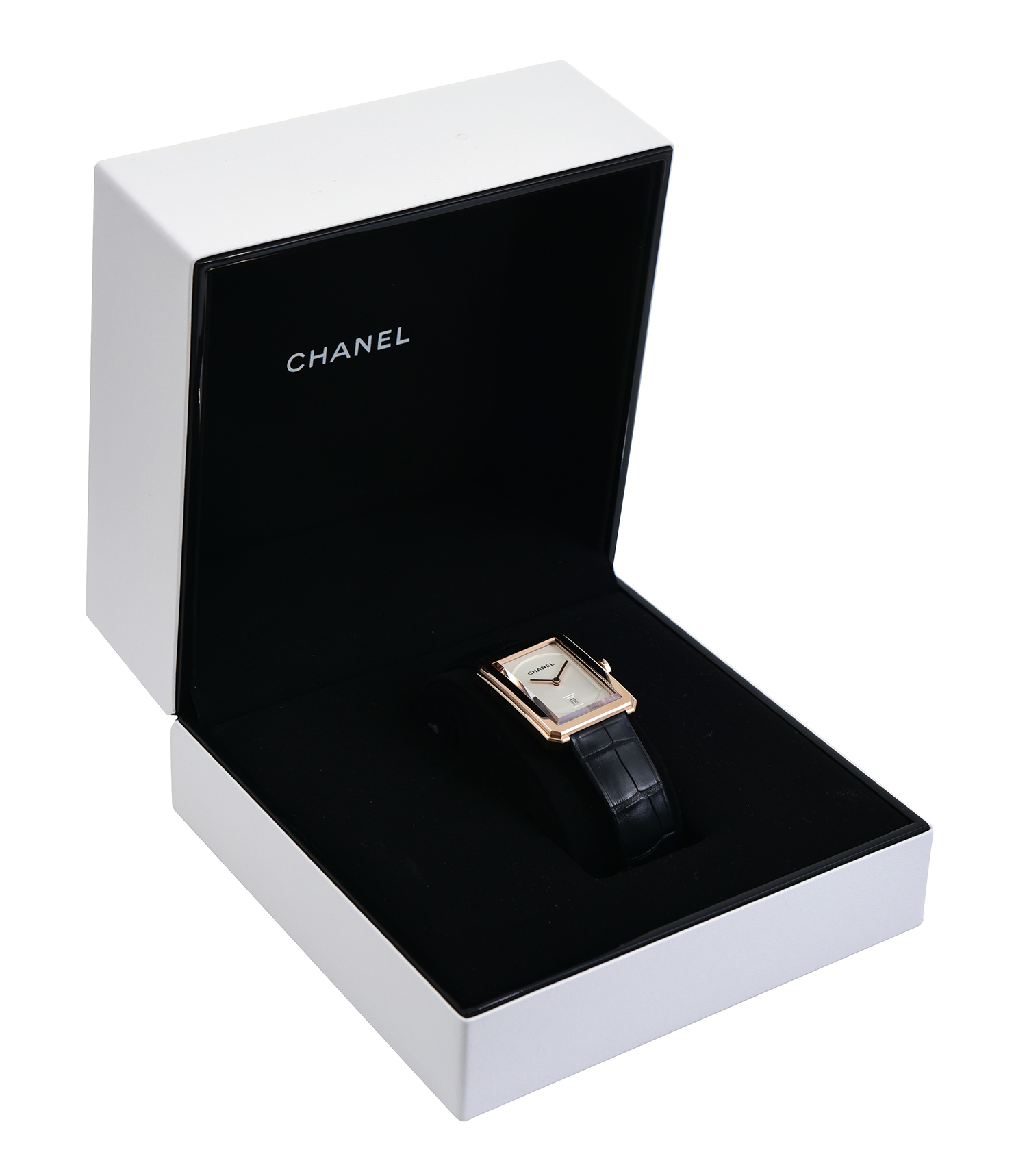 Quartz movement, rectangular cream dial having date at six, signed case, dial and movement, 18ct rose gold case and original black leather bands, 25mm diameter, case length 35mm.