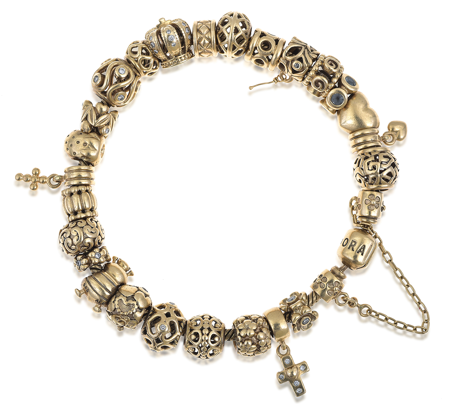 The snake link chain suspended with twenty five assorted charms including diamond and topaz, all mounted in 14ct gold, total length 205mm, signed.