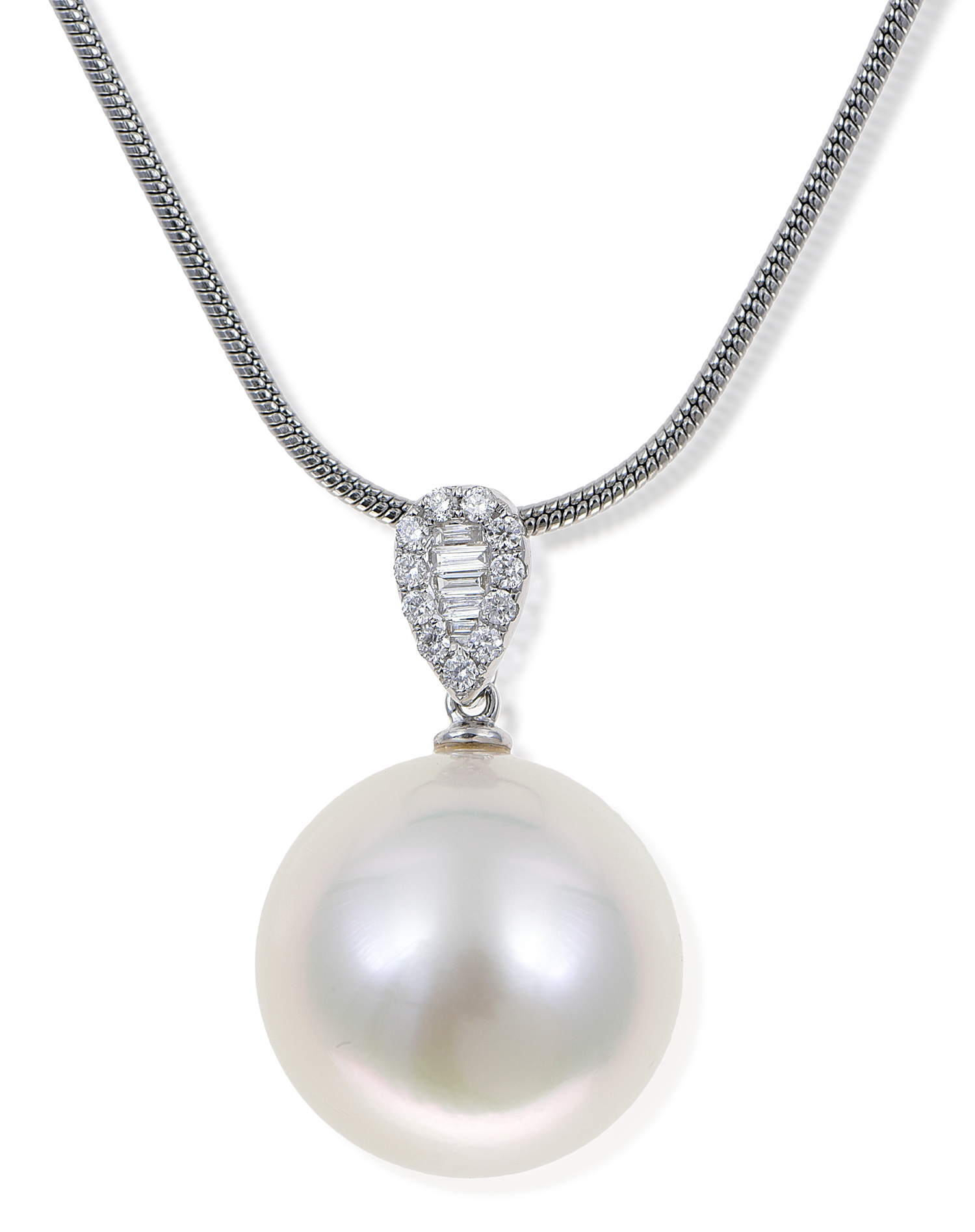 The round pearl of silver and white hues measuring 16.40mm, suspended from a diamond set panel, mounted in 18ct white gold.