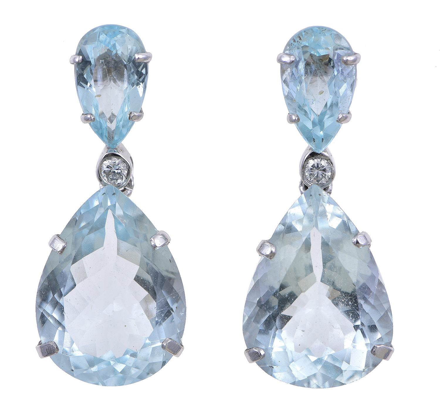 Each featuring a pear cut aquamarine of 5.95cts or 6.95cts, suspended from a round brilliant cut diamond and an oval cut aquamarine, mounted in 18ct white gold.