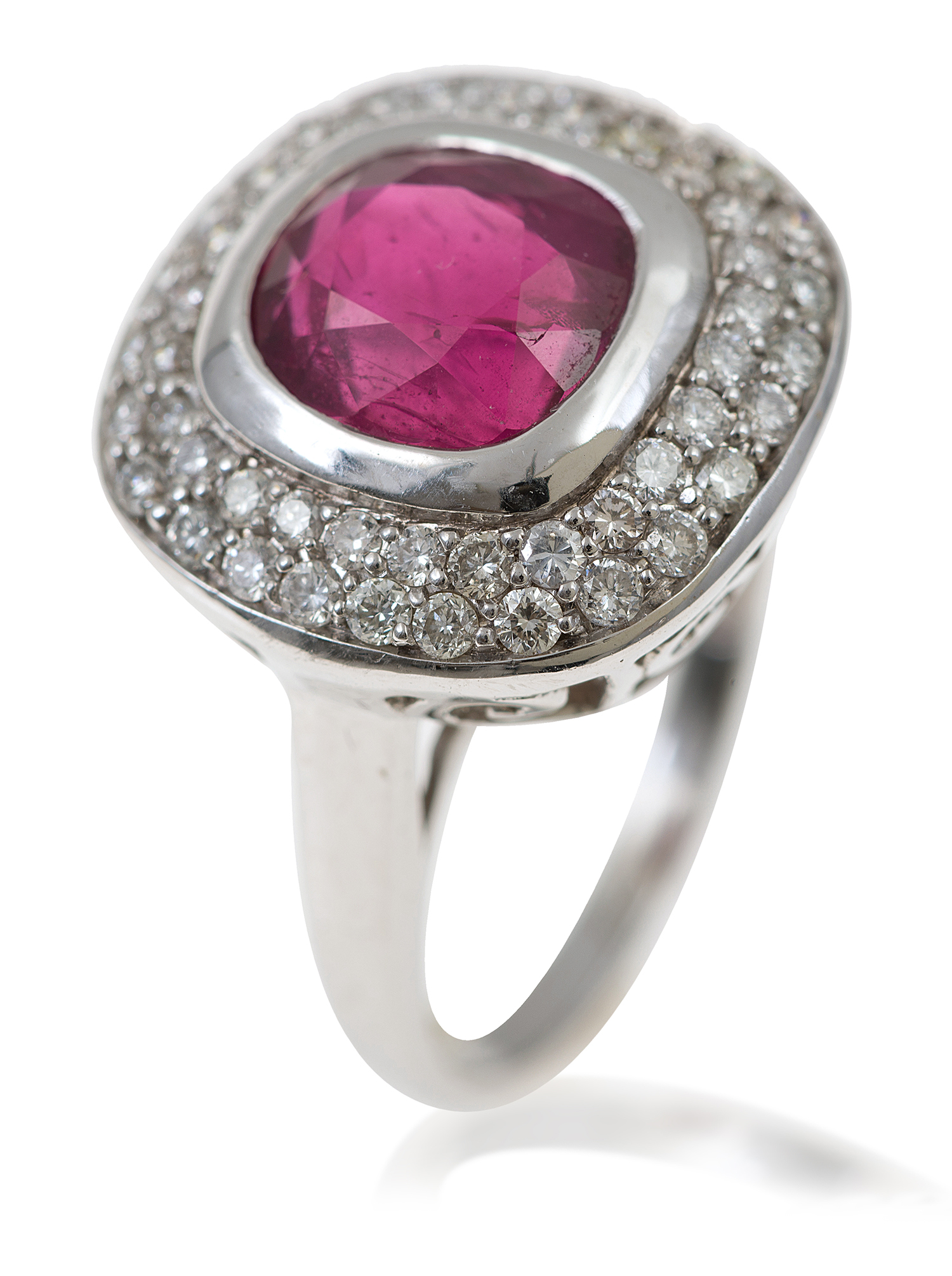 Ring presents in excellent condition and stones are well secured. Ruby is of good even colour. Diamonds are pave set and well matched colour G-H, clarity VS-SI.