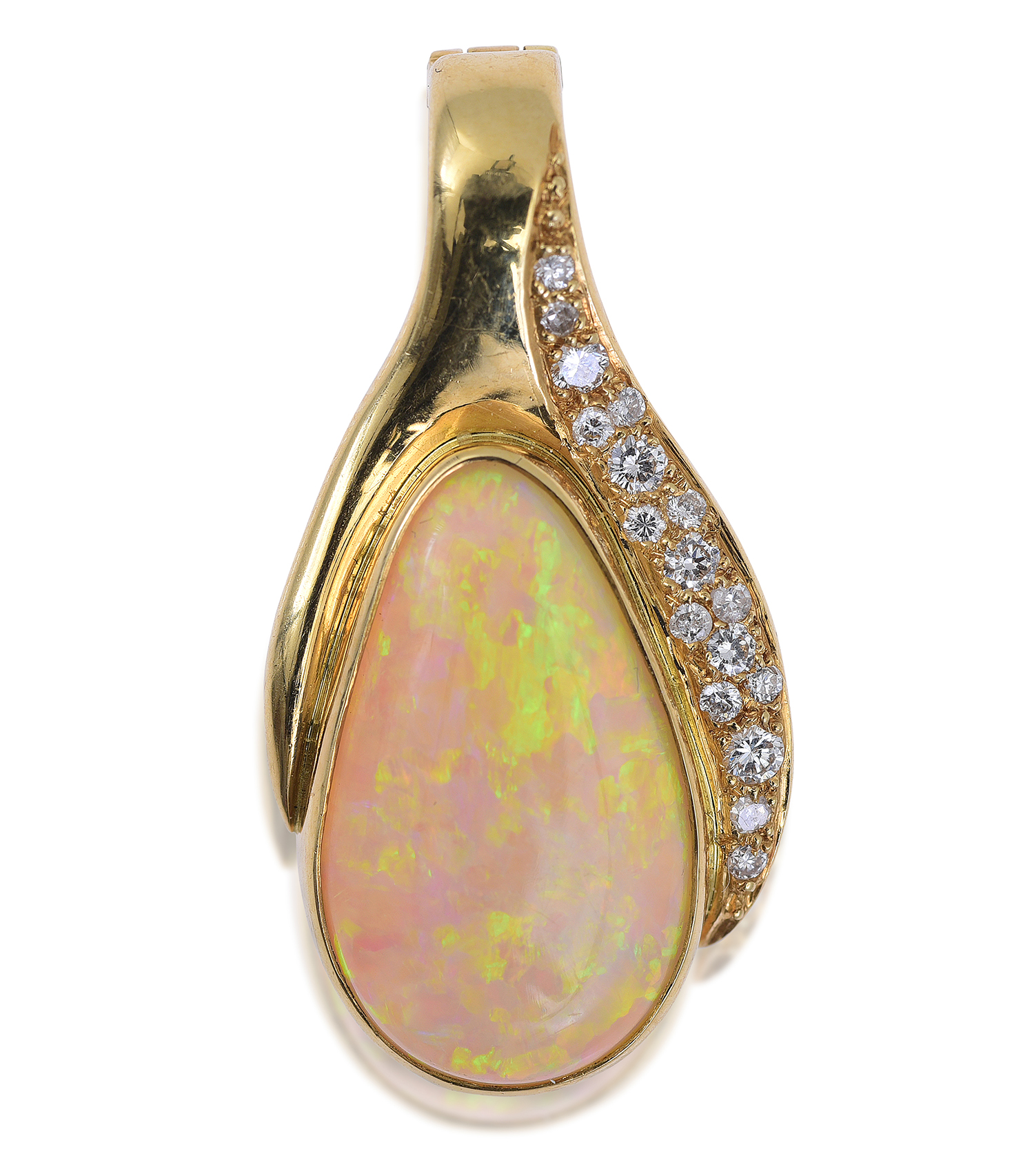 The solid white opal displays a good play of colour. Diamonds are colour G, clarity SI-P.