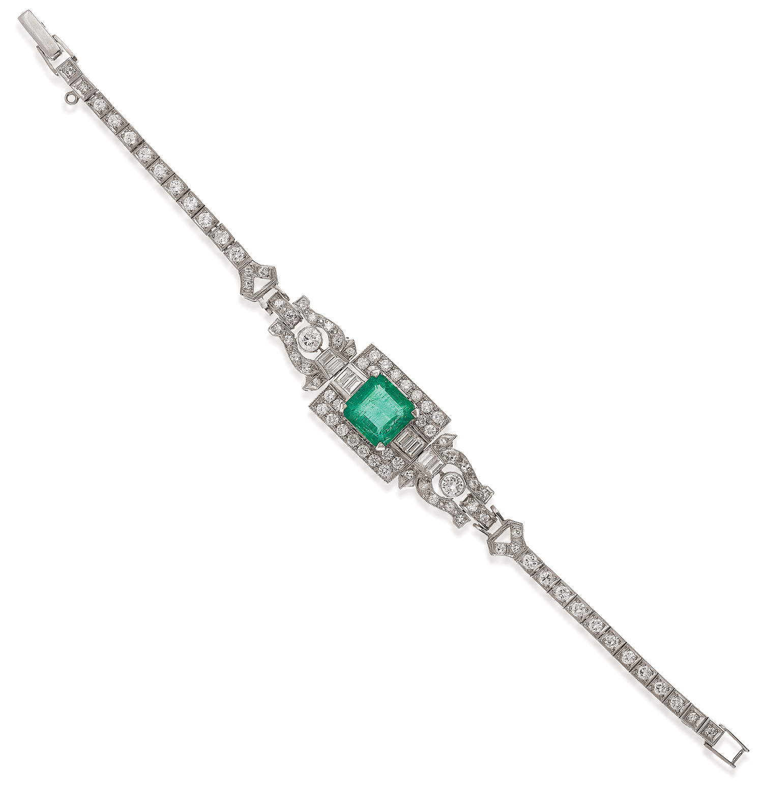 Bracelet presents in good condition. This piece has been married with bracelet watch bands to a later emerald and diamond panel - the outcome is excellent. Diamonds are all of conforming colour and clarity approx G-H, clarity VS-SI. Fitted with a safety chain.