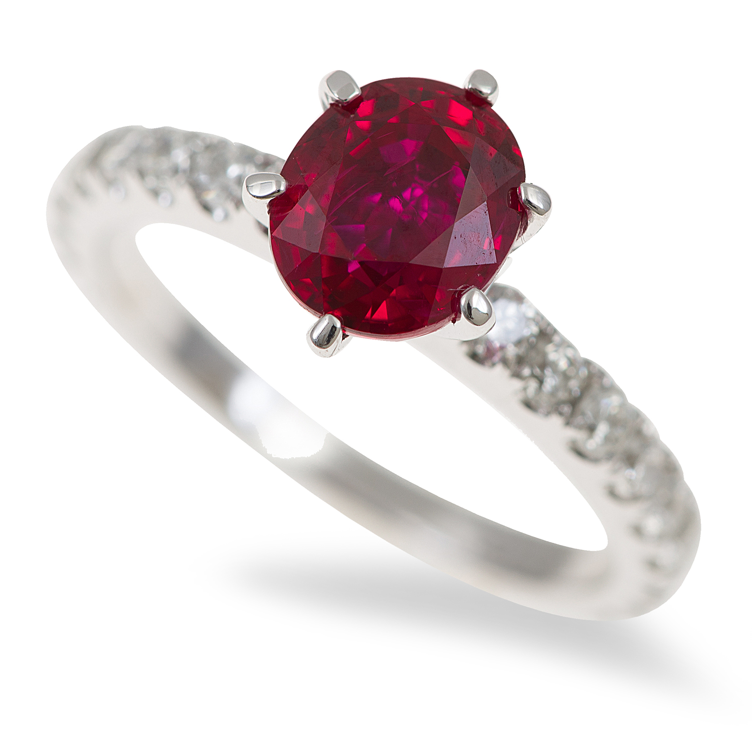 Centrally set with an oval cut ruby of 1.56cts, to diamond set shoulders, mounted in 18ct white gold, ring size I, accompanied by a GSL report stating origin Burma.