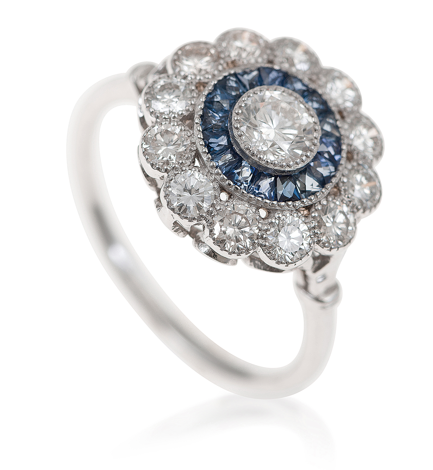 Centrally set with a round brilliant cut diamond of 0.28cts, surrounded by carre cut sapphires and further diamonds, mounted in 18ct white gold, ring size M.