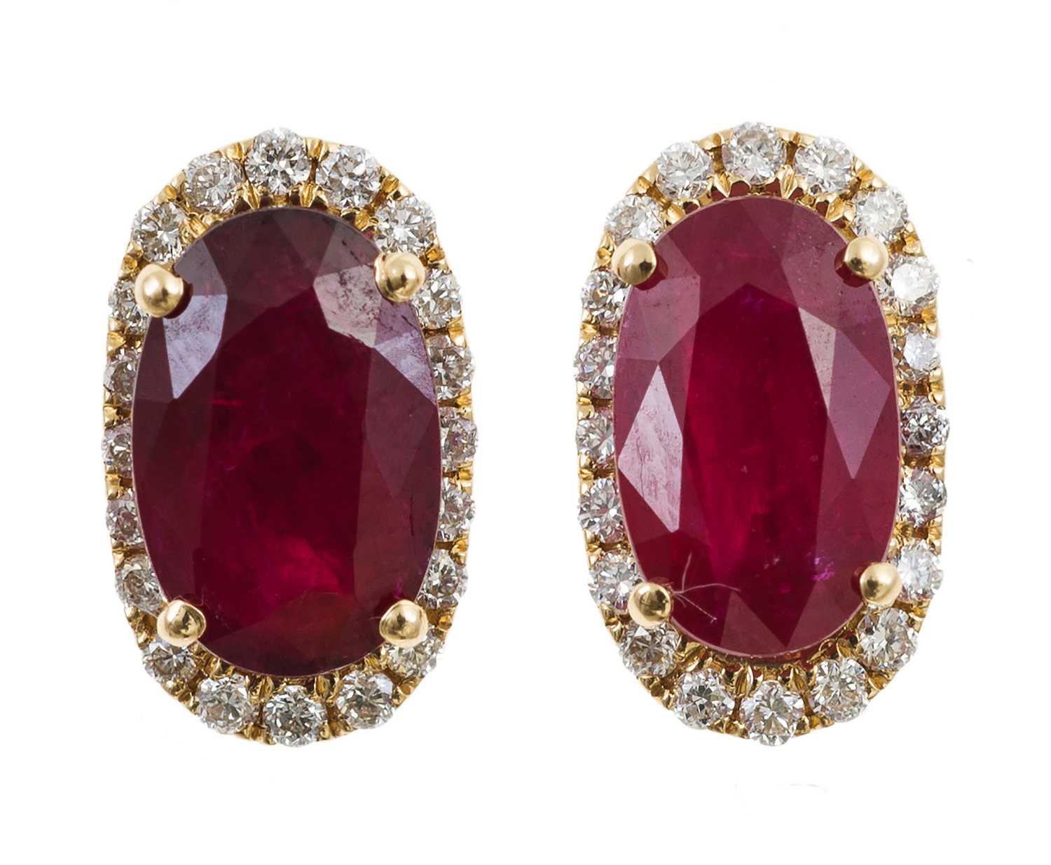 Earrings present in as new condition and stones are secure in their settings. Stones are well matched and are of good commercial quality. Ruby weights cannot be obtained due to constraints of setting however dimensions are 7.77mm x 5.10mm.