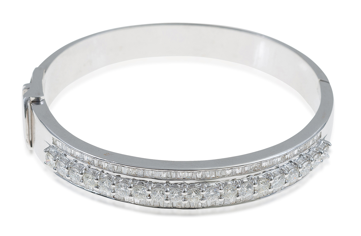 The oval hinged bangle centrally set with a row of round brilliant cut diamonds totalling 1.90cts, surrounded by tapered baguette cut diamonds, all mounted in 18ct white gold.