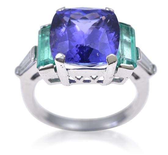 The cushion cut tanzanite of 7.38cts, flanked by two emerald cut emeralds totalling 1.56cts with further diamond detail to the shoulders, mounted in 18ct white gold, ring size N, accompanied by an IGI certificate.