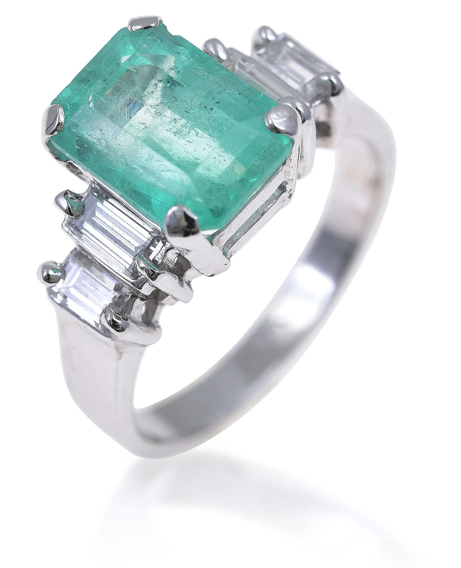 The emerald cut emerald having stepped baguette cut diamonds set to the shoulders, mounted in 18ct white gold, ring size M-N.