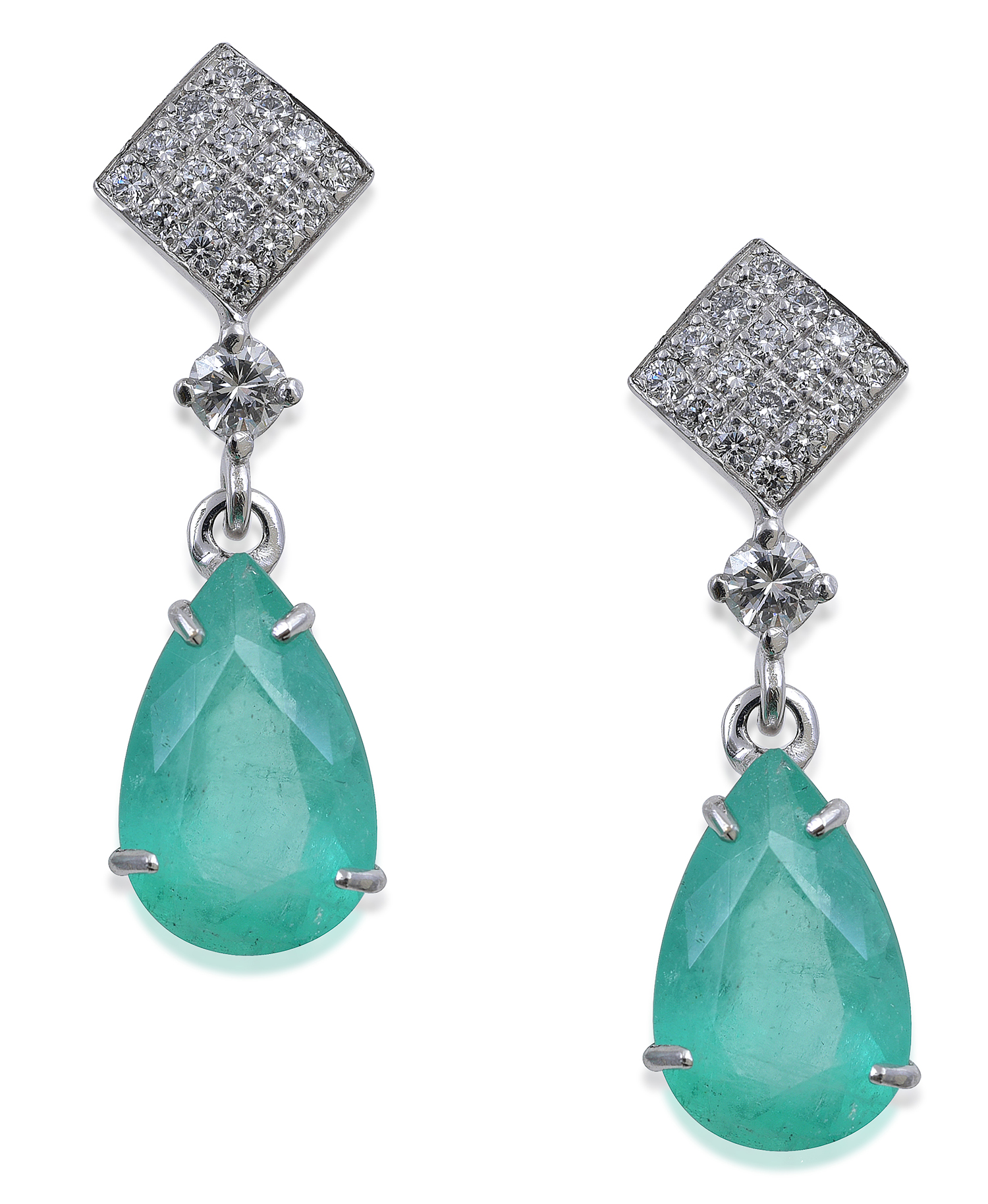 Each earring featuring a pear cut emerald of 3.95cts, surmounted by round brilliant cut diamonds totalling 0.32cts, mounted in 18ct white gold.