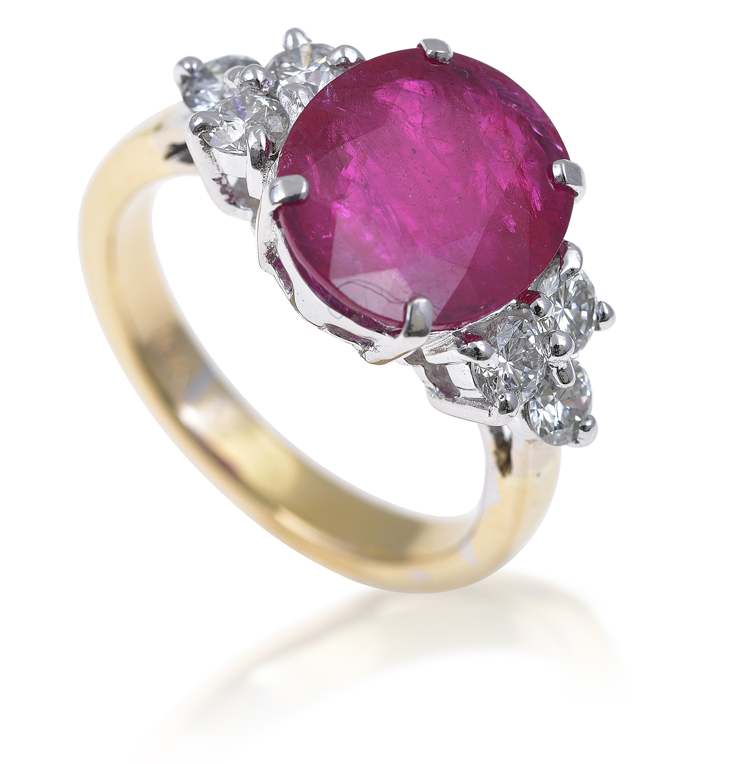 The oval cut ruby of 4.20cts having a trefoil of round brilliant cut diamonds set to each shoulder, mounted in 18ct gold, ring size O.