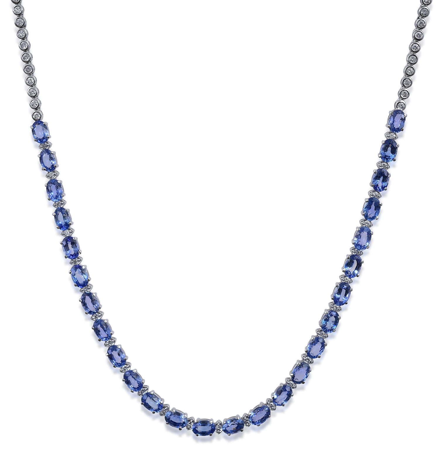 Featuring twenty six oval cut sapphires totalling 16.70cts, interspaced and finished with round brilliant cut diamonds of 1.38cts total, all mounted in 18ct white gold, total length 430mm.
