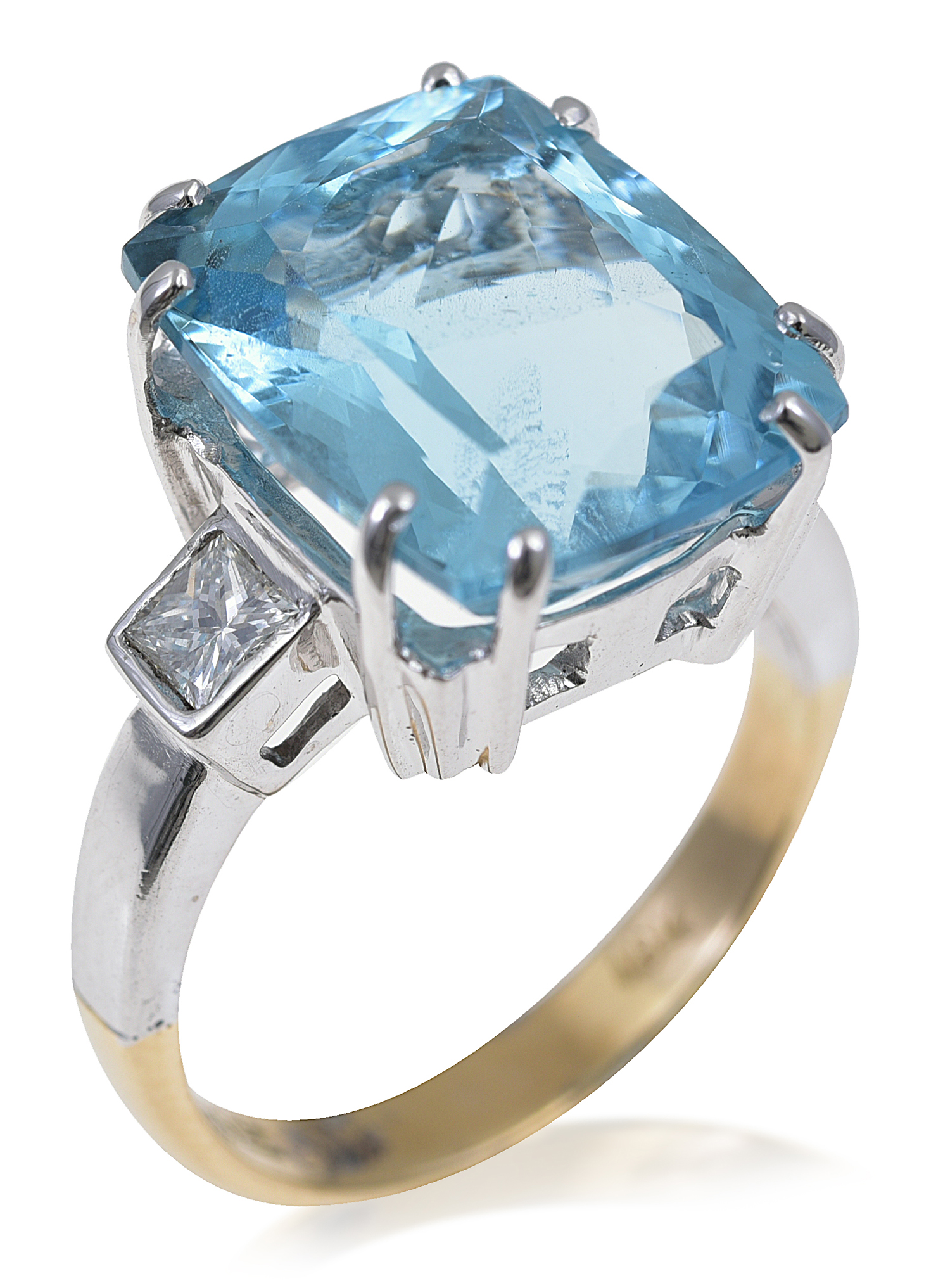The square cut aquamarine of 9.00cts having diamond detail set to the shoulders totalling 0.58cts, mounted in 18ct gold, ring size O.