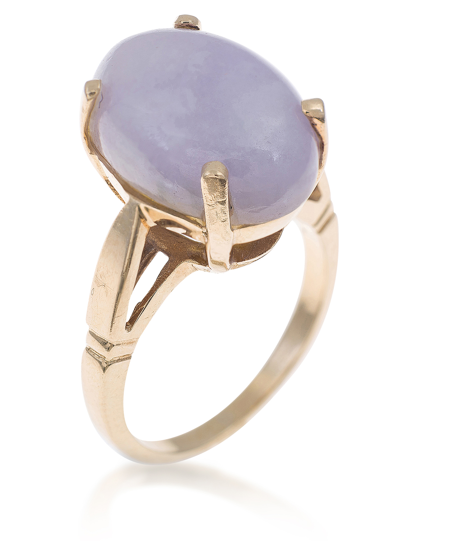 Centrally set with an oval lavender jade cut en cabochon, mounted in 14ct gold, ring size M-L.