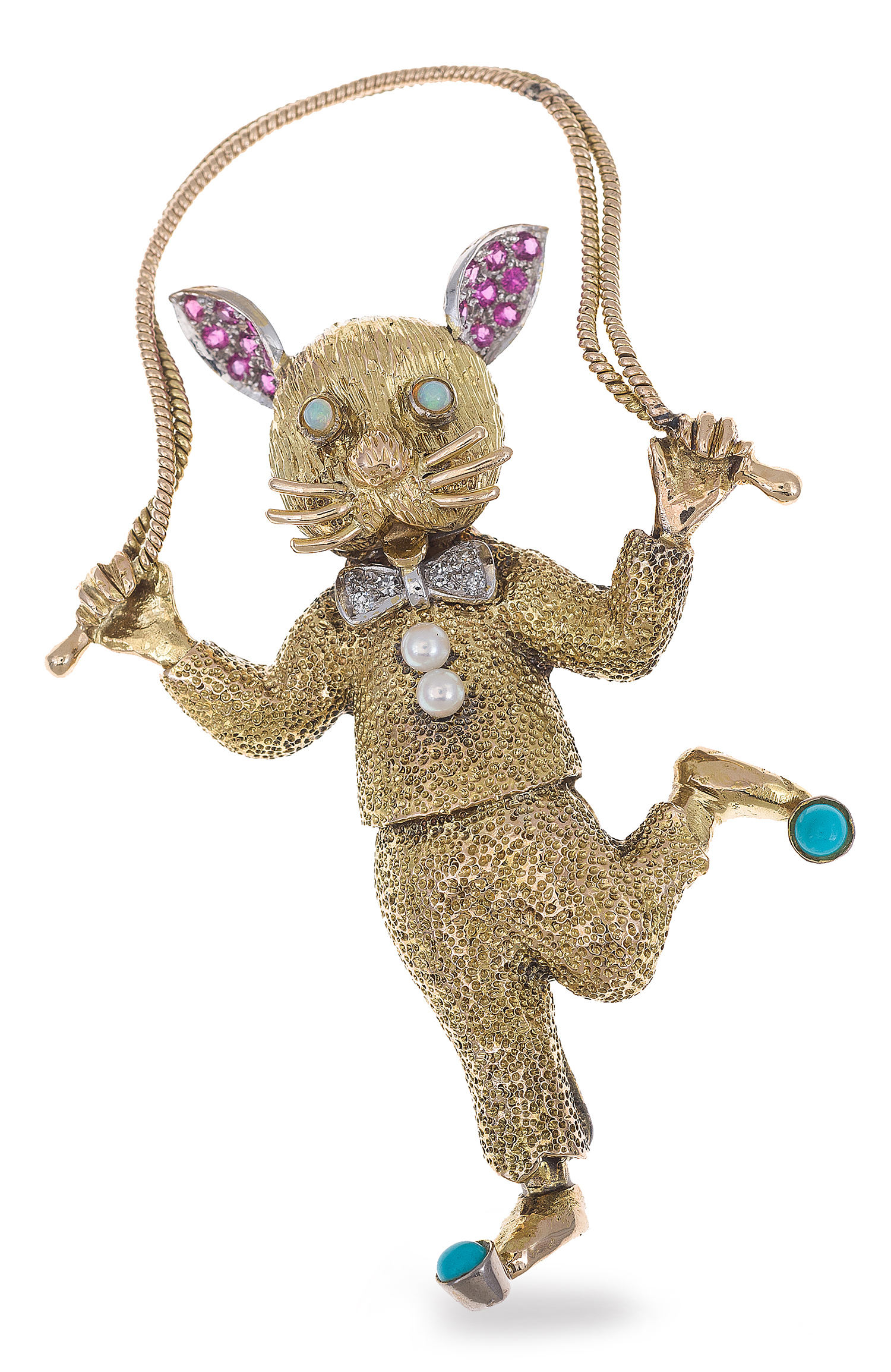 Set with rubies, diamonds, turquoise and pearls mounted in 18ct gold.