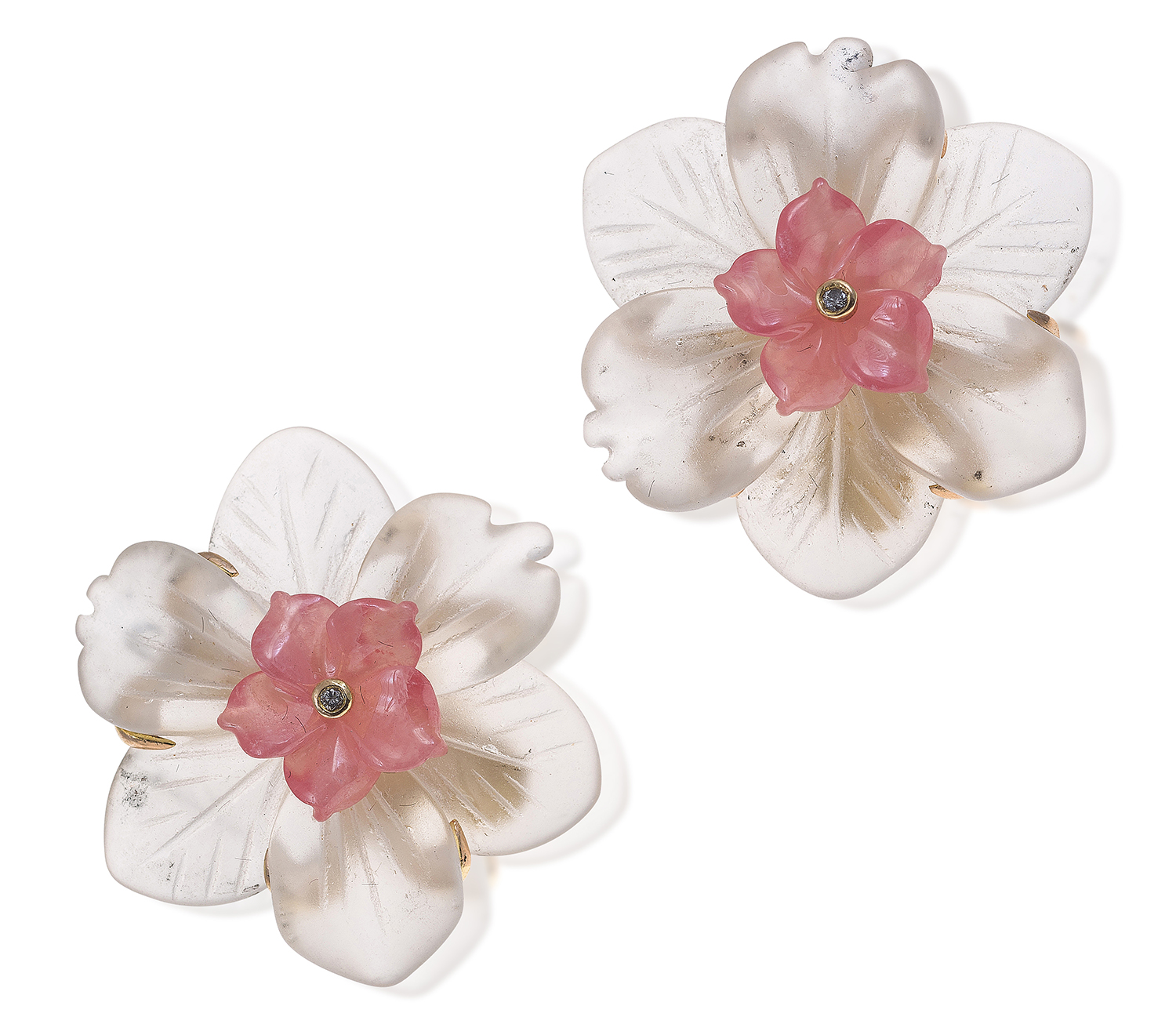 The rock crystal flower overlaid with smaller pink quartz petals and centred with a round brilliant cut diamond, mounted in 14ct gold.