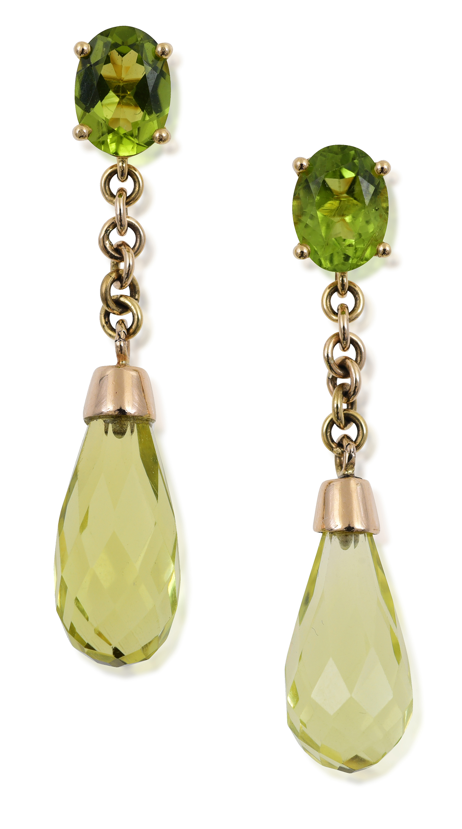 Each set with a briolette and oval cut peridot mounted in 14ct gold.