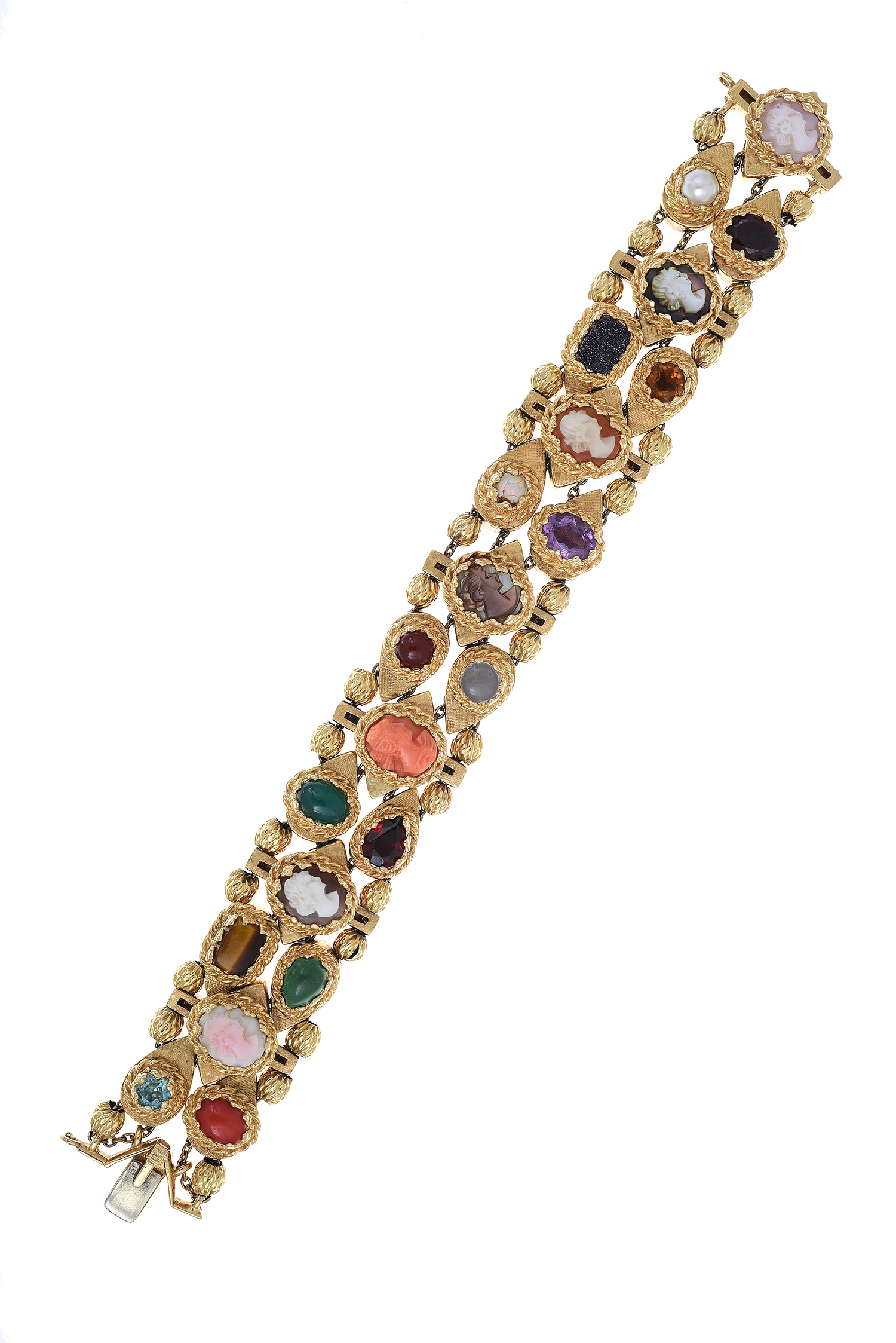 Comprising seven various cameos surrounded by semi-precious stones, mounted in 14ct gold, total length 185mm.