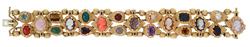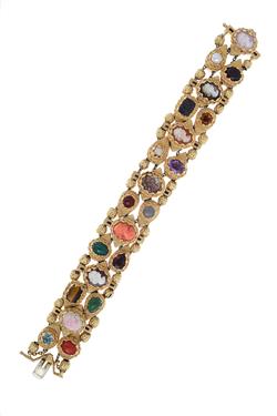 Bracelet presents in good condition. Semi precious stones include: pearl, garnet, goldstone, citrine, coral, sardonyx, tigers eye, aventurine quartz, opal Weight 79.6 gms.