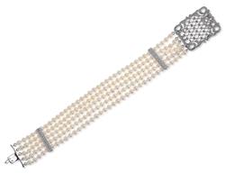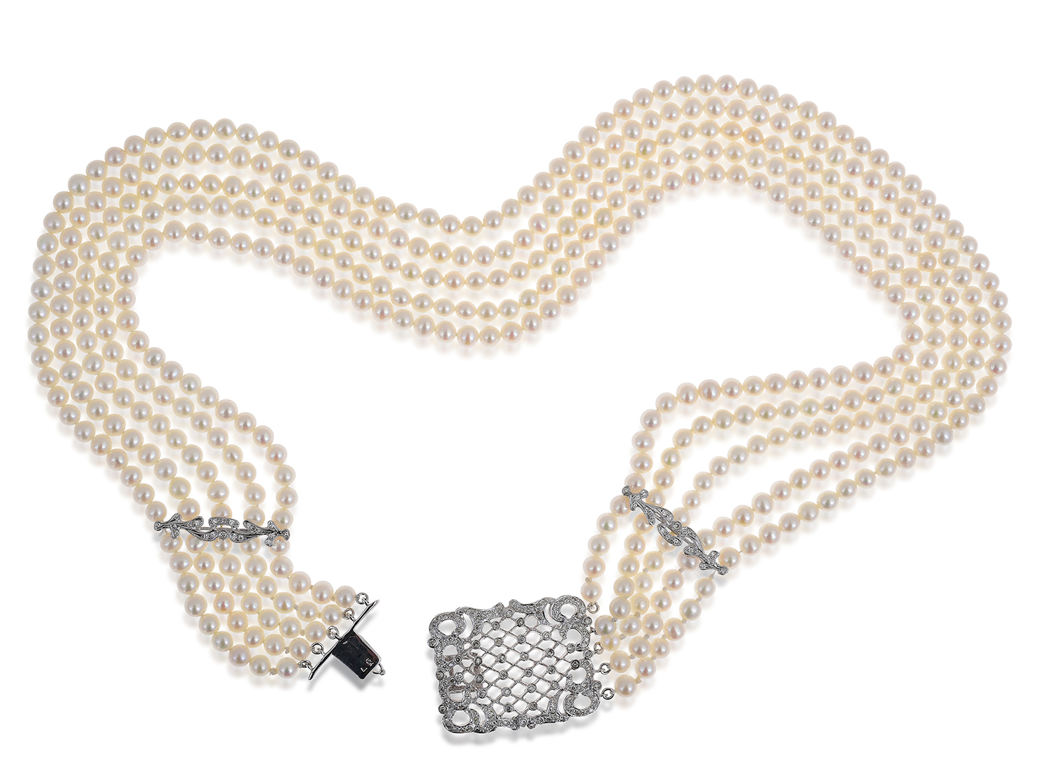 Each comprising five strands of round cultured pearls offset with an openwork clasp and interspacers set with round brilliant cut diamonds in 18ct white gold, total length 430mm and 185mm.