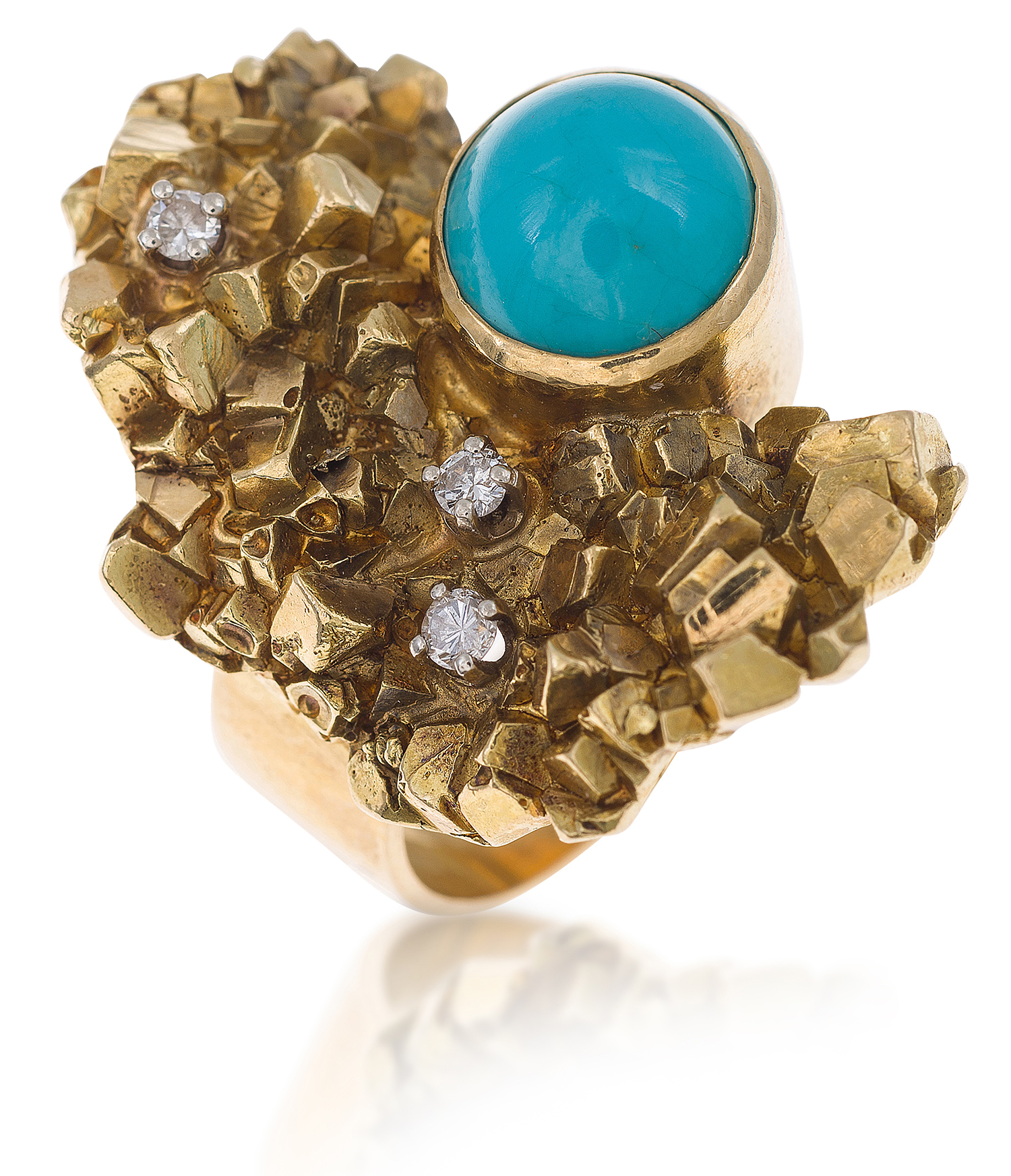 Of sculptural design featuring a round turquoise cut en cabochon and highlighted by three round brilliant cut diamonds, mounted in 18ct gold, signed, ring size O-P.