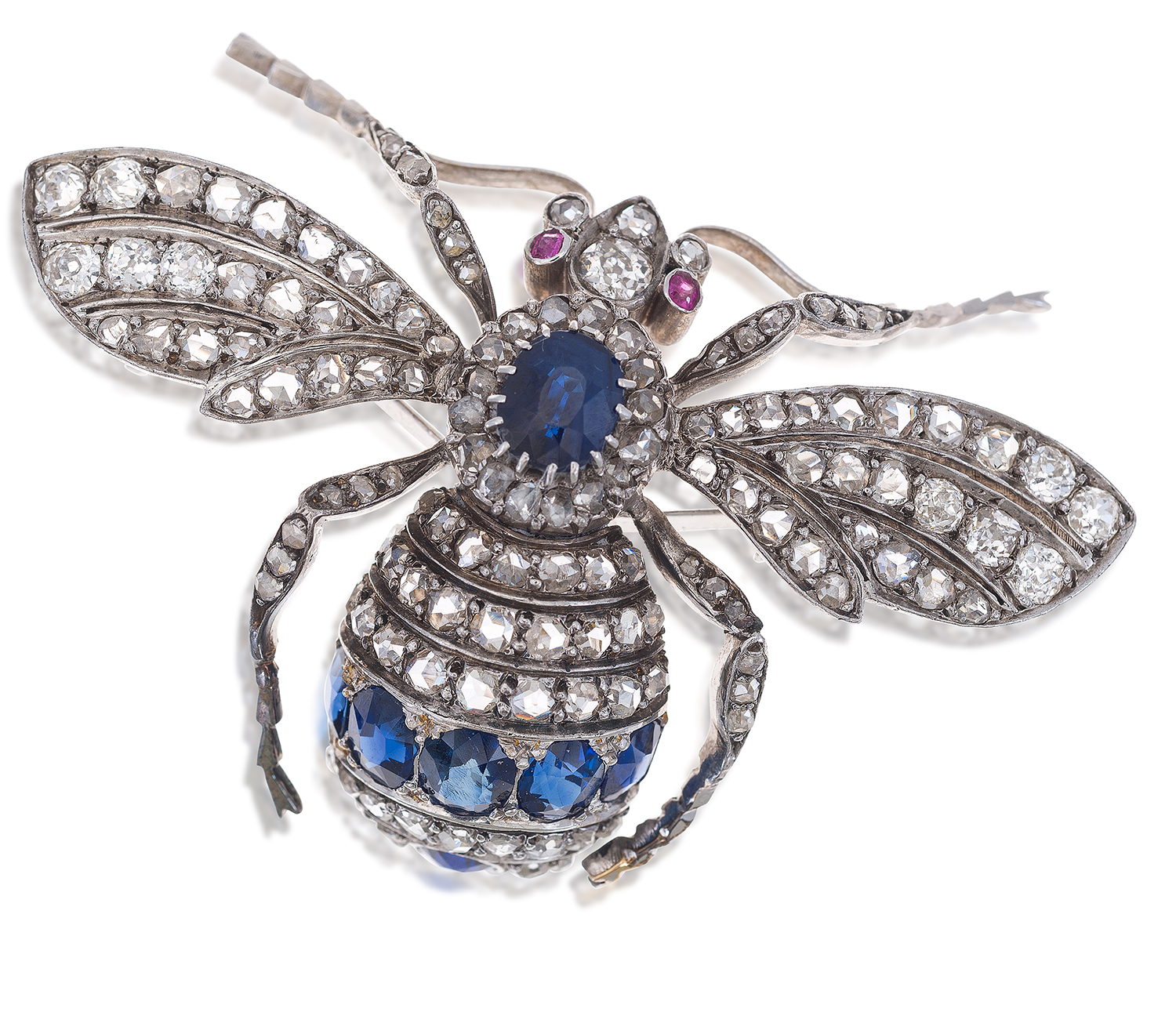 The large insect having seven oval cut sapphires set to the body, with rose and old European cut diamonds set to the body, wings and legs, finished with ruby set eyes, all mounted gold.