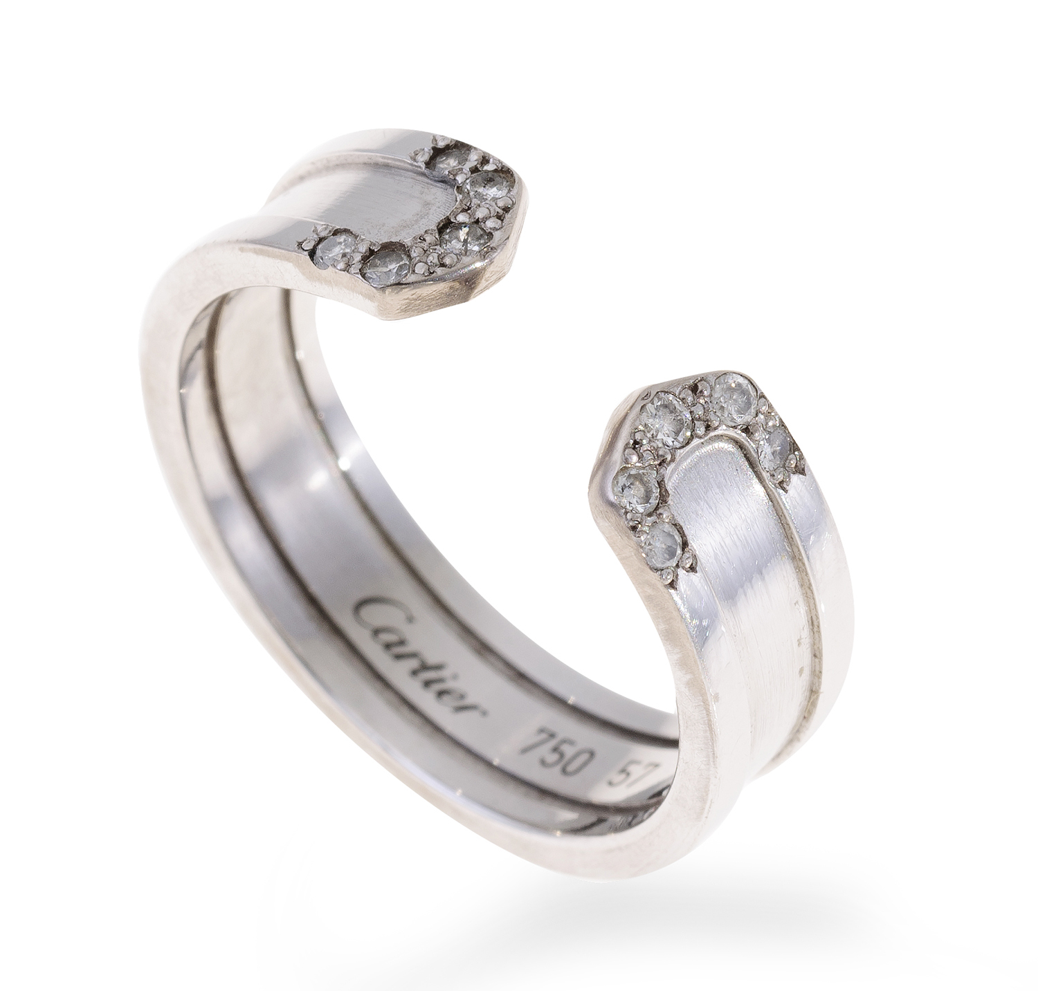 Of open design with diamond set terminals, mounted in 18ct white gold, signed, reference number GV2457, ring size S, with papers.