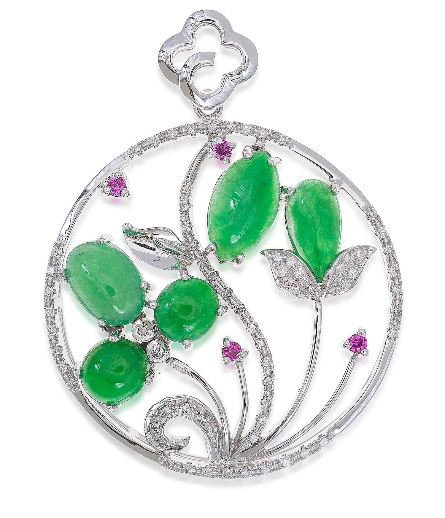 The circular pierced panel set with polished panels of jadeite with diamond and ruby detail throughout, mounted in 18ct white gold.
