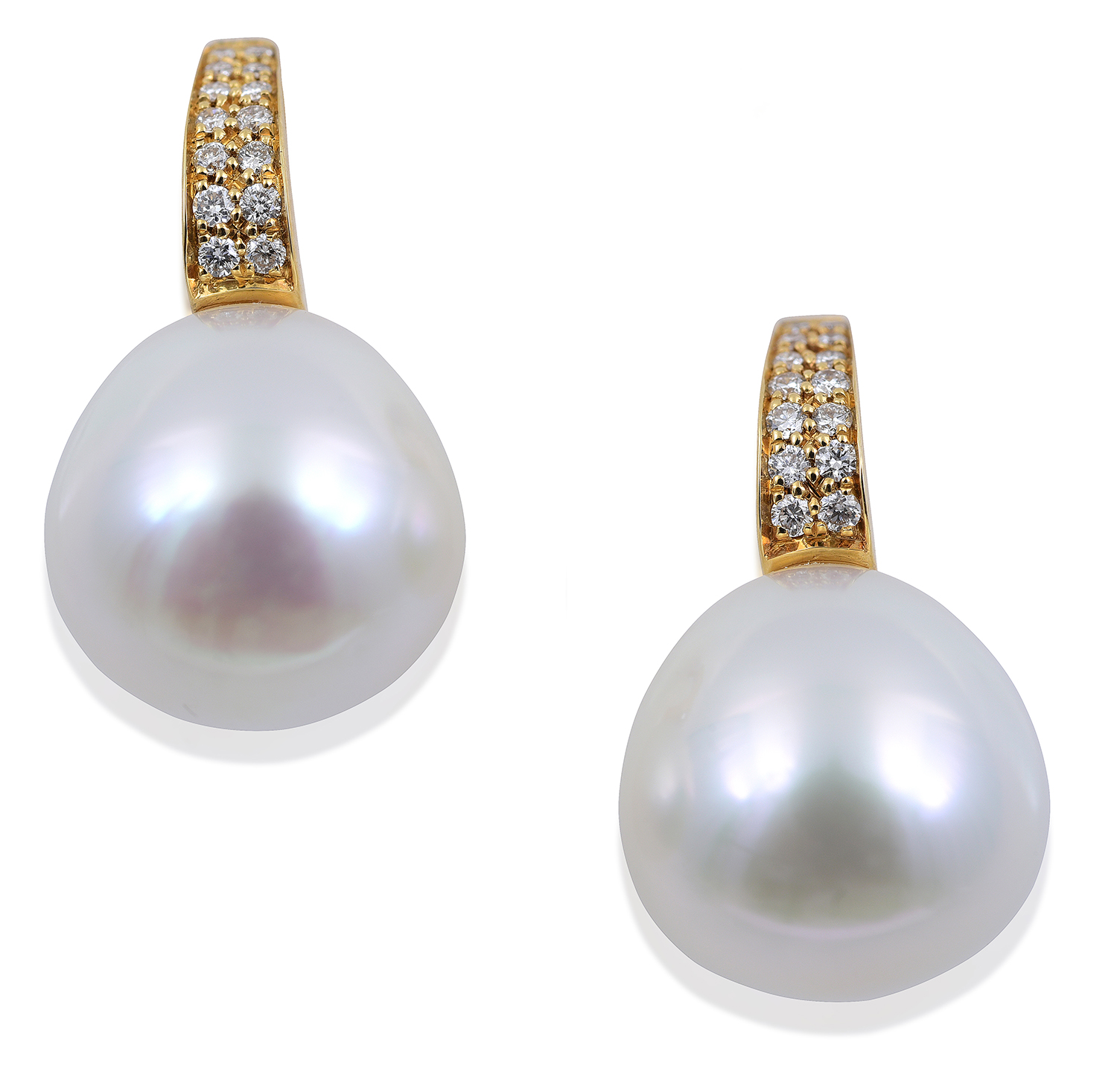 Each earring set with a tear drop shaped pearl of silver and white hues measuring 13.6mm, surmounted by a pave set diamond panel, mounted in 18ct gold.