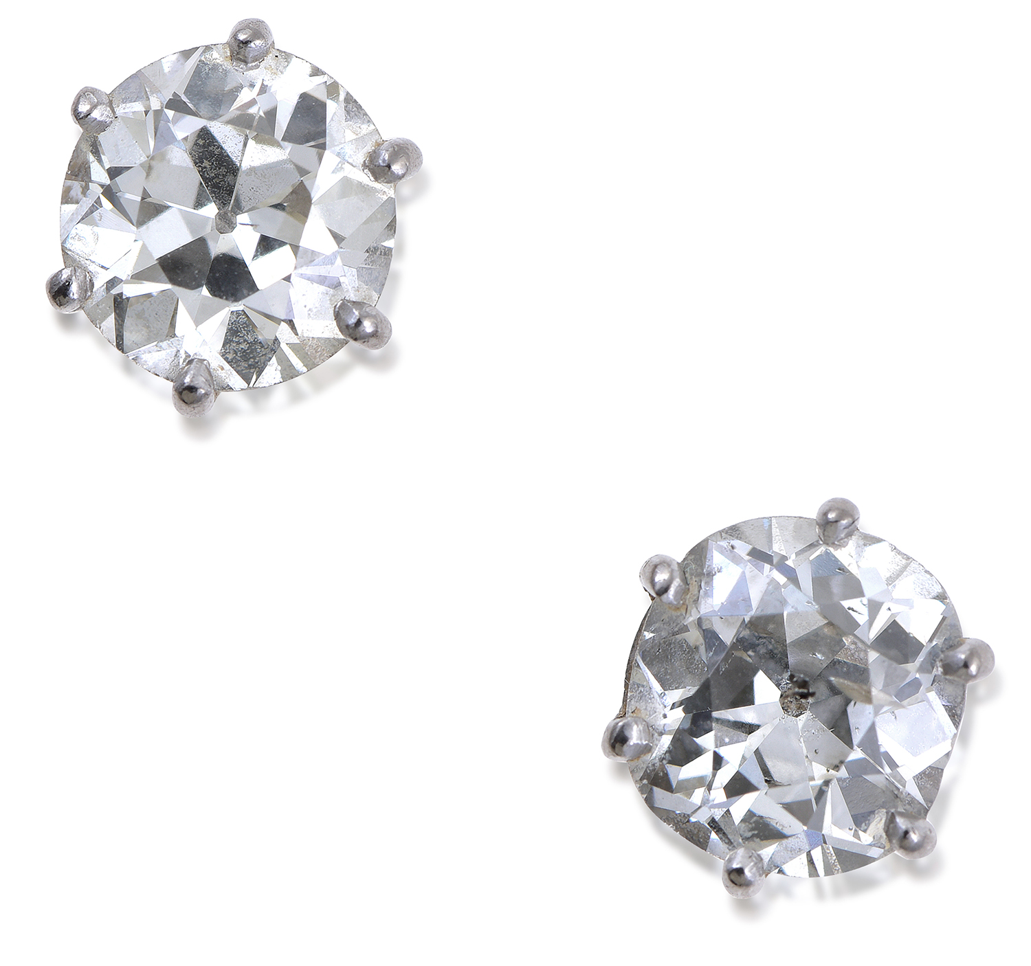 Having threaded posts and butterfly back. Diamond weights are approximate due to the constraints of the settings. Leonard Joels measurements for the stones are 8.42 x 7.75 x 5.20mm and 8.24 x 7.82 x 5.1mm. We believe colour is I-J for both stones and clarity is SI1 for one stone and P1 for the other