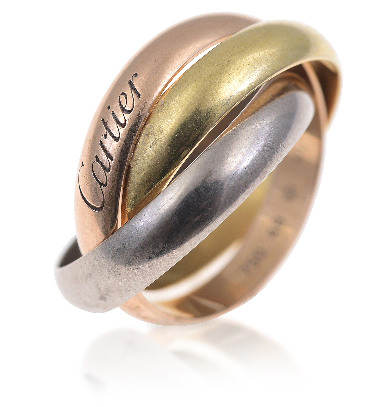 From the Trinity de Cartier collection, the ring modelled in tri-coloured 18ct gold, signed, reference VU0552, ring size H.