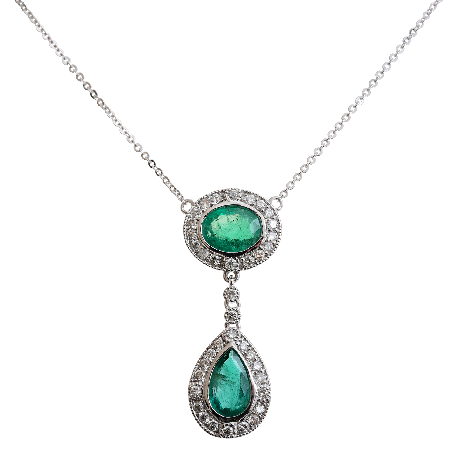 Necklace presents in good condition and stones appear well secured. Pear cut emerald has an abrasion to the edge of the table and a crown facet. A number of two and three phase inclusions are present throughout the emeralds. Diamond are of good commercial quality.