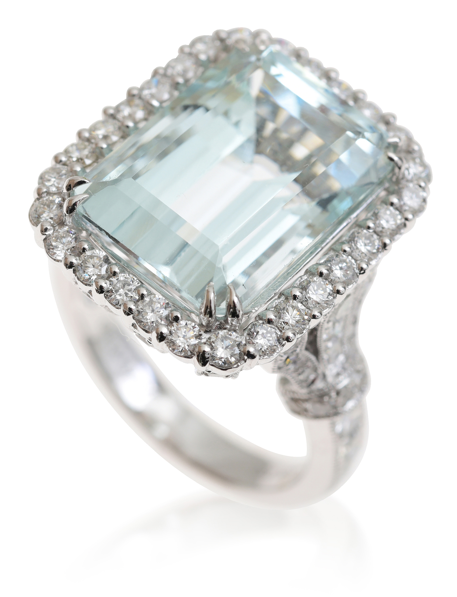 The emerald cut aquamarine of 10.79cts, surrounded by round brilliant cut diamonds totalling 1.89cts, mounted in 18ct white gold, ring size N.