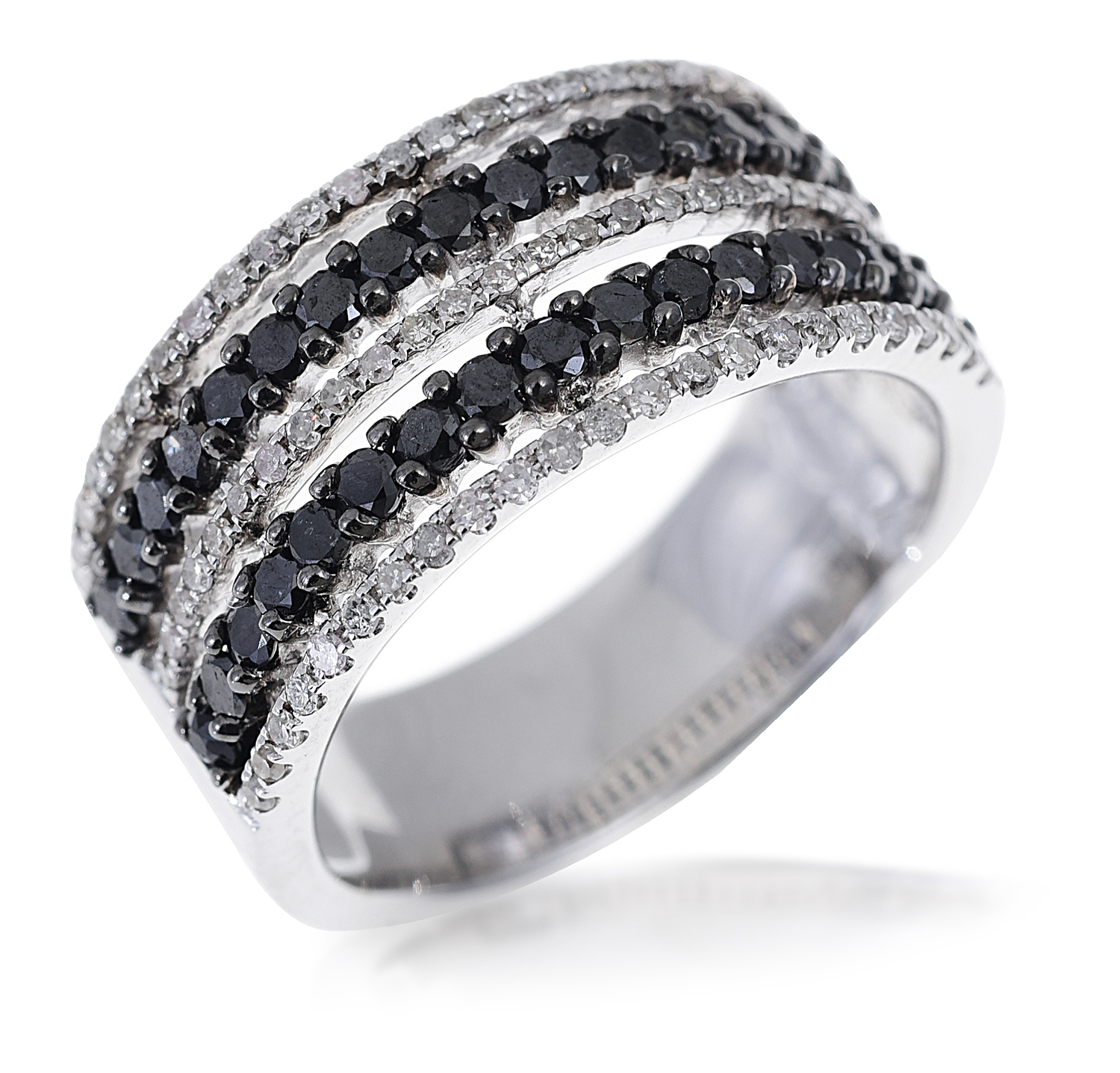 Featuring five pierced rows of alternating black and white round brilliant cut diamonds totalling 1.01cts, mounted in 18ct white gold, ring size N.