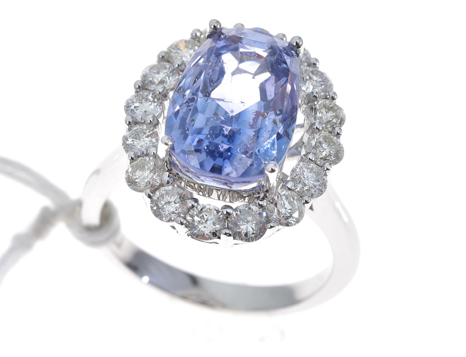 The oval cut sapphire of 8.77cts, surrounded by sixteen round brilliant cut diamonds totalling 1.32cts, mounted in 18ct white gold, ring size N.