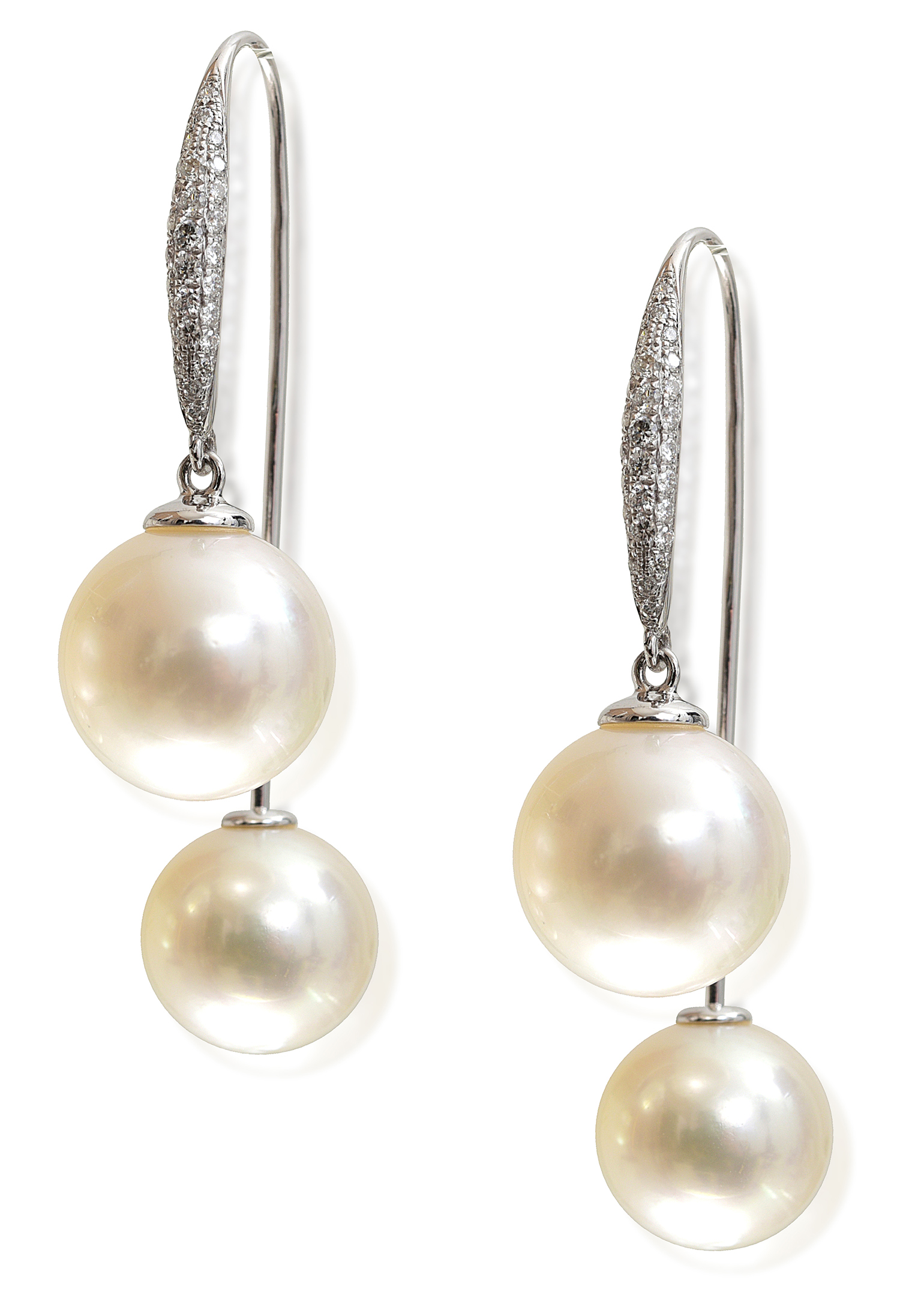 Each featuring a round South Sea pearl of silver and white hues of 14.0mm suspended from an elongated hook pave set with diamonds and terminating with a smaller pearl of 12.5mm, all mounted in 18ct white gold.