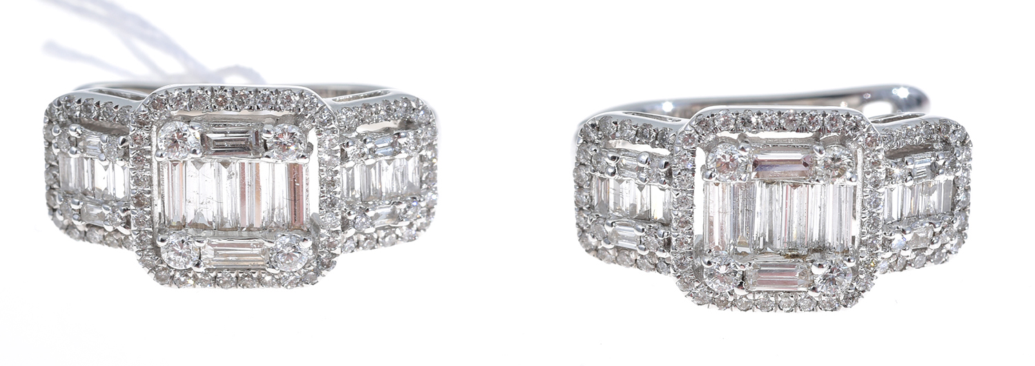 Each domed and pierced panel featuring three clusters set with baguette and round brilliant cut diamonds totalling 1.00cts, mounted in 18ct white gold.