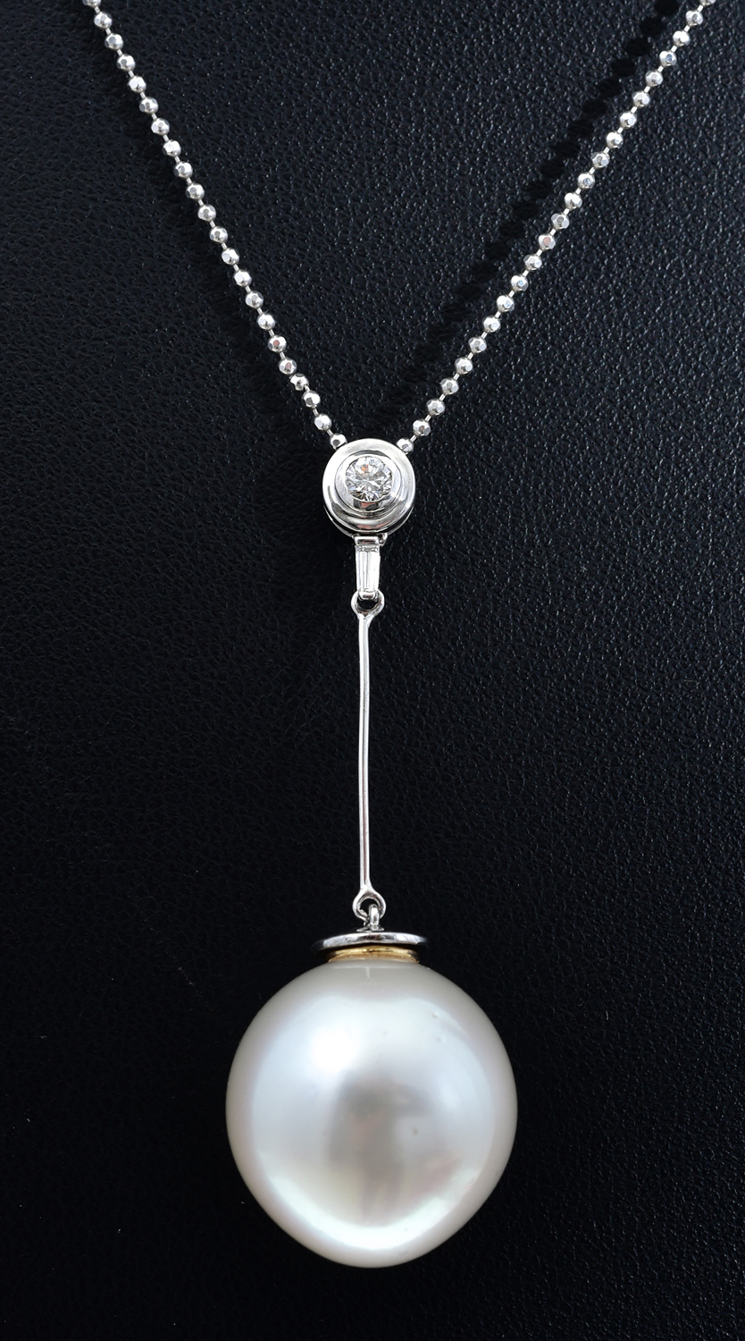The round pearl of silver and white hues measuring 16.90mm, suspended from wirework with baguette and round brilliant cut diamond detail and a fine bead chain, all mounted in 18ct white gold, total length 400mm.