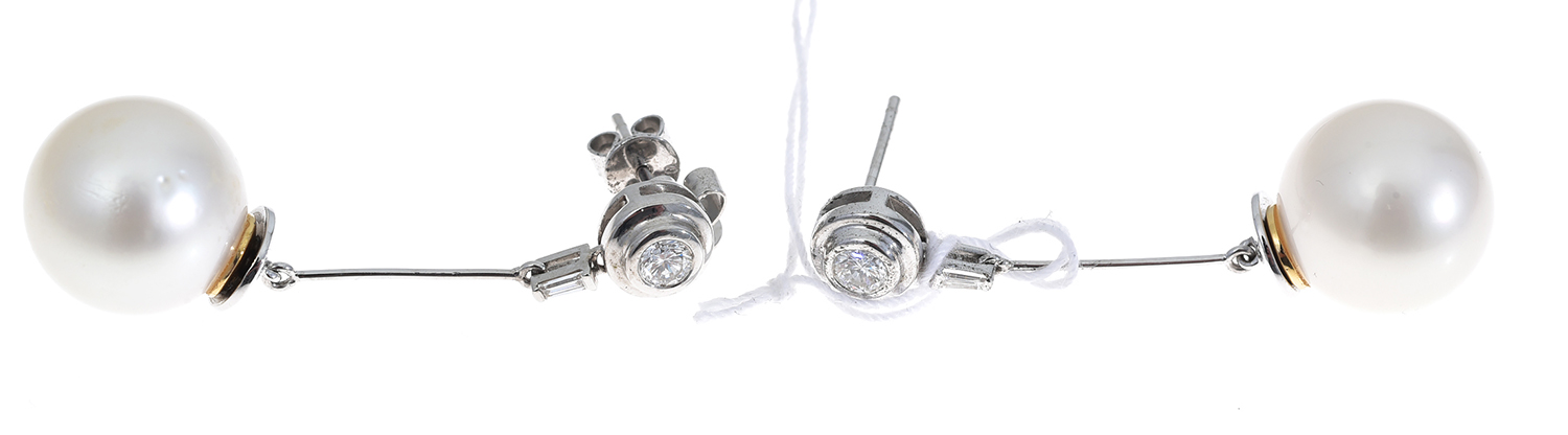 Each round pearl of silver and white hues measuring 13.10mm, suspended from wirework with baguette and round brilliant cut diamonds set to the surmount, mounted in 18ct white gold.