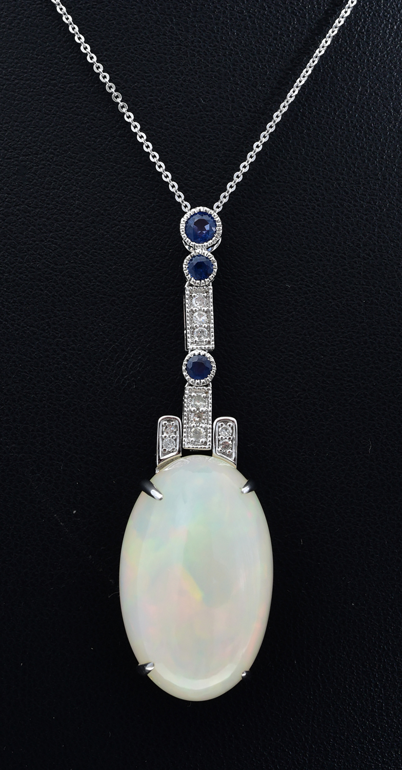 The oval solid opal cut en cabochon of 19.24cts, suspended from a geometric panel set with round brilliant cut diamonds and sapphires, to a fine trace chain, mounted in 18ct white gold, total length 420mm.