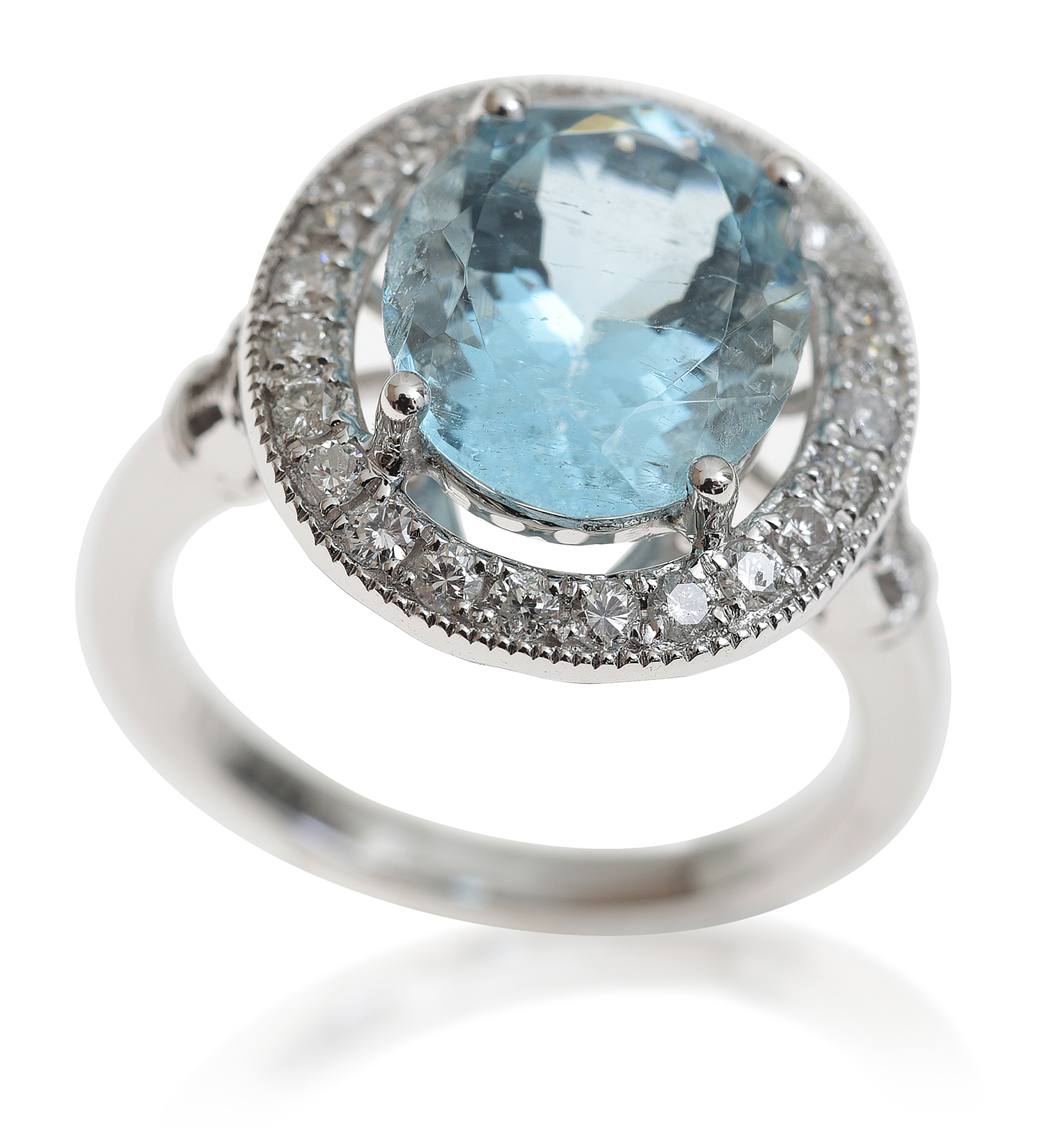 The oval cut aquamarine of 8.28cts having round brilliant cut diamonds set to the pierced surround, mounted in 18ct white gold, ring size M.