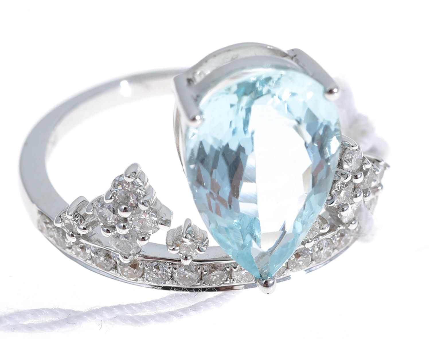 Modelled as a crown, the pear cut aquamarine of 3.03cts having round brilliant cut diamond detail set below, mounted in 18ct white gold, ring size M.