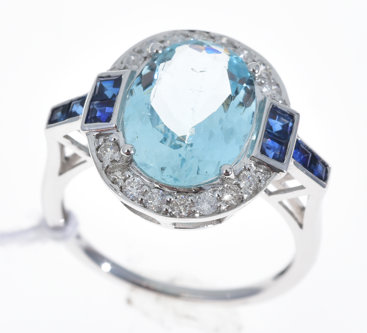 The oval cut aquamarine of 2.59cts, having diamond and sapphire detail set to the surround and shoulders, mounted in 18ct white gold, ring size M.