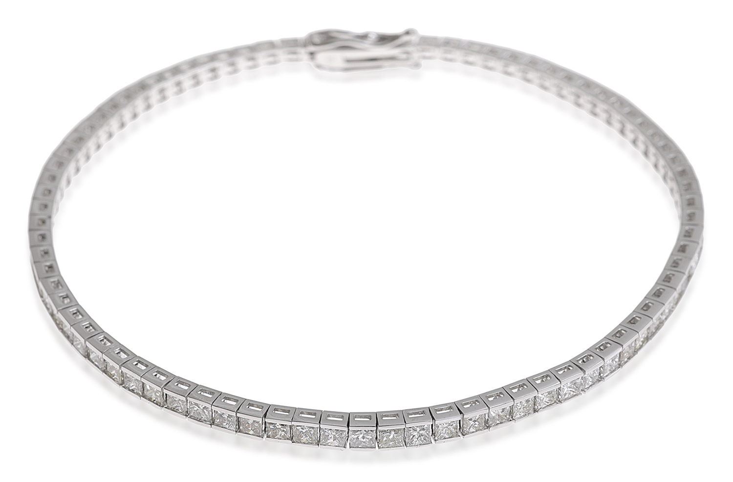 The eighty one princess cut diamonds totalling 5.01cts, mounted in 18ct white gold, total length 180mm.