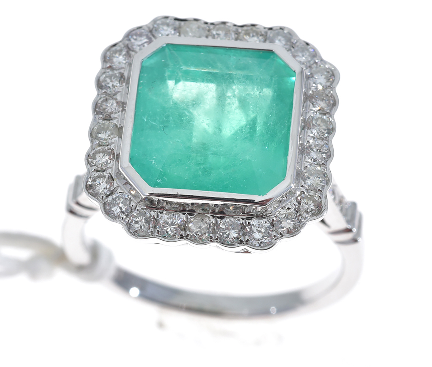The emerald cut emerald of 6.09cts, set with round brilliant cut diamonds to the surround and shoulders totalling 0.66cts, mounted in 18ct white gold, ring size N.