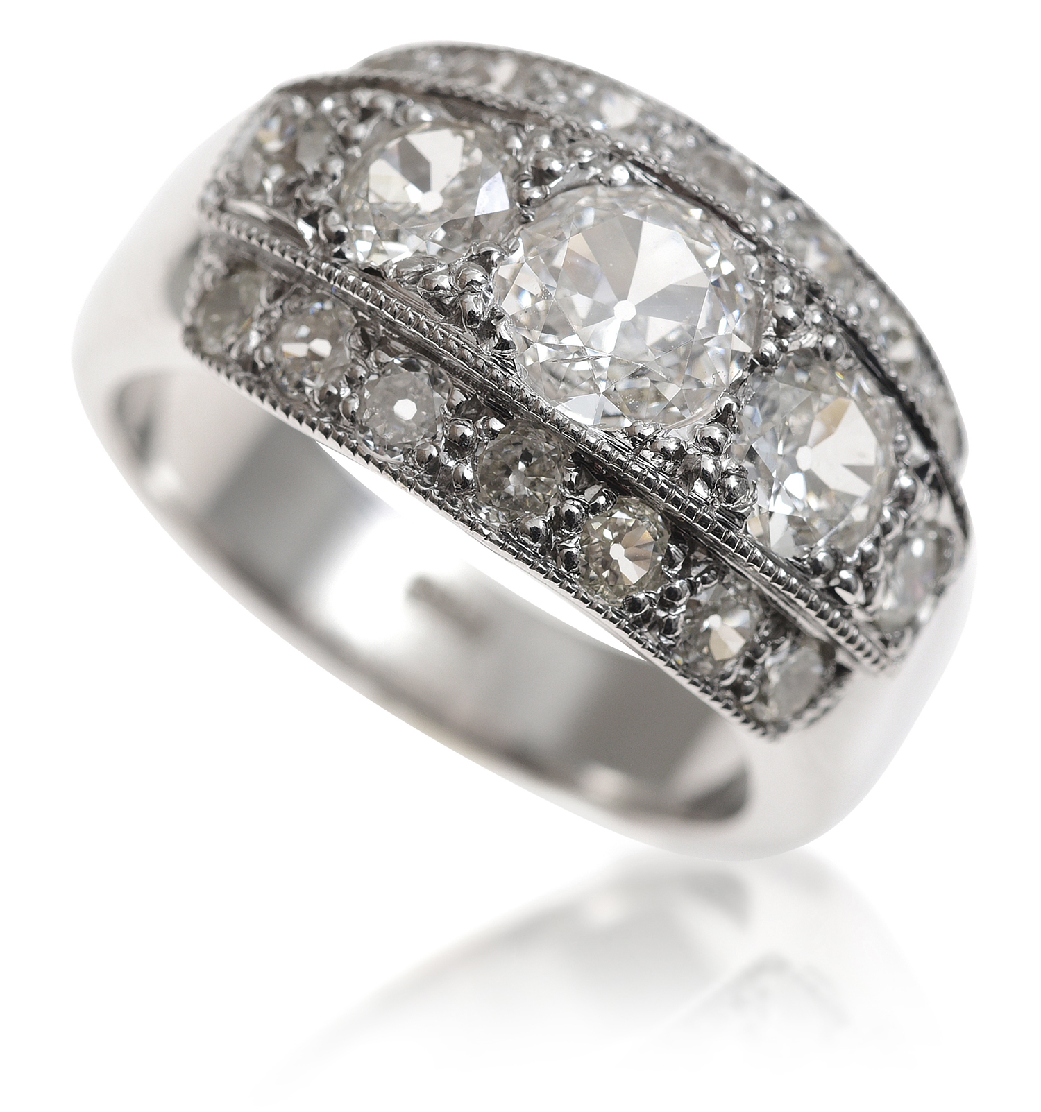 Featuring a graduated row of five old style vintage cut diamonds surrounded by fourteen further diamonds all totalling 2.20cts, mounted in 18ct white gold, ring size O.