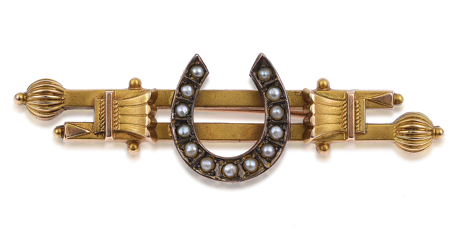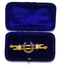 The central horse shoe set with seed pearls to a double bar brooch, mounted in 15ct gold.