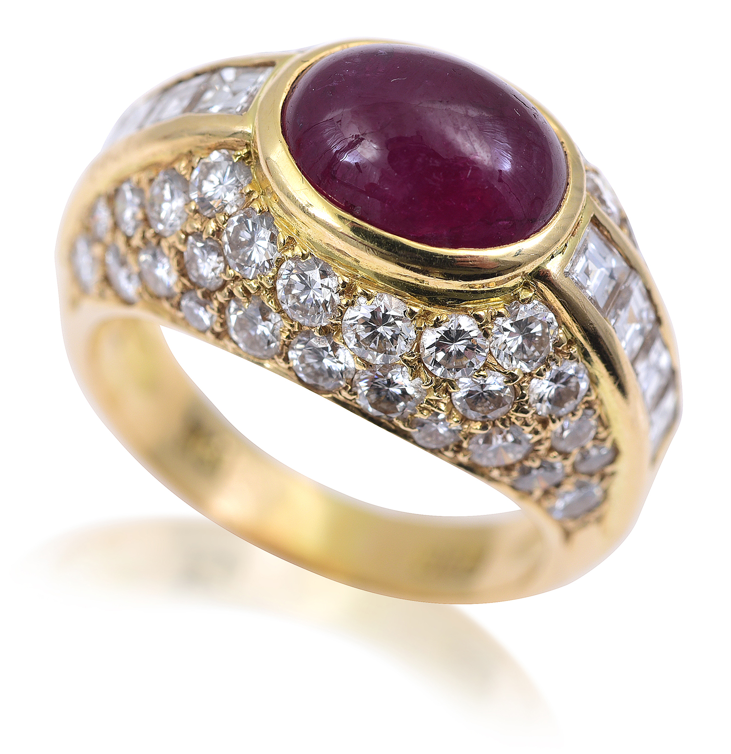 The domed panel centrally set with an oval ruby cut en cabochon, having princess cut diamond set to the shoulders and further pave set diamond detail throughout, mounted in 18ct gold, ring size K.