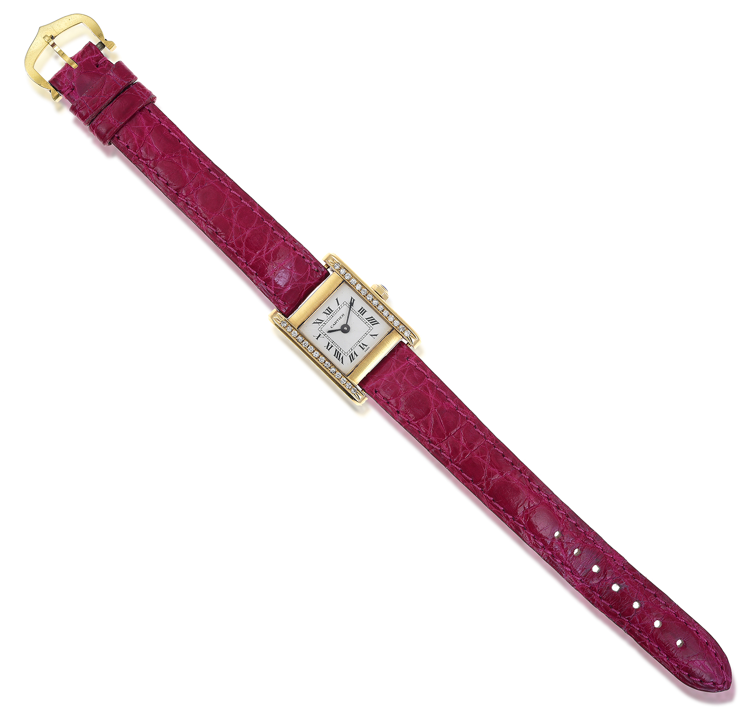 Manual wind movement, square cream dial with black Roman numerals, signed case, dial and movement, case reference 7809302, 18ct gold case with diamond detail and original pink leather bands, case length 25mm.